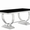Bring glamour to your dinner parties with this bold dining table from the Antoine Collection Silverfinished hoops make up the base for incredible sculptural appeal making a dramatic impression that guests are sure to remember The top is crafted from durable tempered glass for durability and easy upkeep
