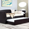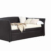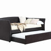 Bring a touch of class to your bedroom with this transitionally styled daybed Fully upholstered in dark brown faux leather this bed is sleek and stunning The arms curve outward at a smooth angle creating a bold and fun design The back frame is wellplaced and comfortable for use as a sofa A pullout trundle provides a second bed