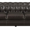 This ultraplush feather down topped sofa in brown bonded leather is a pinnacle of class and high style Its hightrack rolled arms and tufted seating contribute to its traditional aesthetic Quality and durability also abound thanks to its solid wood frame and square wooden legs in dark finish Pair with its companion loveseat and chair for a complete living room set