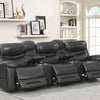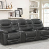 • Five-piece power home theater seating upholstered in charcoal top grain leather everywhere the body touches• Three (3) power reclining seats with power headrest• Wall hugger mechanism• Switch panel with 2.1A USB and home button• Console features soft-closing lift top storage with power outlet (2AC/2USB) and two (2) cup holders with removable stainless steel inserts• Pocket coil seating• 1” 3.0lbs cool gel memory foam topper