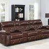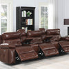 • Five-piece power home theater seating upholstered in chocolate top grain leather everywhere the body touches• Three (3) power reclining seats with power headrest• Wall hugger mechanism• Switch panel with 2.1A USB and home button• Console features soft-closing lift top storage and two (2) cup holders with removable stainless steel inserts• Full foam seating• 1” 3.0lbs cool gel memory foam topper• Certi-Pur certified foam