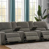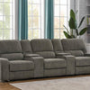 • Five-piece power home theater seating upholstered in beige performance chenille• Three (3) power reclining seats with power headrest• Wall hugger mechanism• Switch panel with 2.1A USB and home button• Console features soft-closing lift top storage with dual USB outlet and two (2) cup holders with removable stainless steel inserts• Pocket coil seating• 1” 3.0lbs cool gel memory foam topper