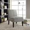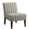 A sleek armless design this slipper chair offers comfort and style in a clean package The multicolor woven upholstery features vertical columns of floralinspired shapes in blues and yellows Contrasting cappuccino legs support this chairs frame and thick cushioning This chairs vibrant pattern makes it an excellent choice for the living room set in need of a statement piece of furniture