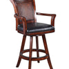 Pairing with the Traditional Ornate Brown Bar Unit this bar stool also boasts a beautiful traditional design Perhaps the bar stools most notable feature is the intricate faux wicker lining the back of the stool You are sure to find comfort with the upholstered cushion seat and wood arm rests A warm brown finish envelopes the entire stool making it as inviting as it is comfortable