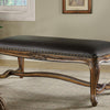 This elegant Black Faux Leather Accent Bench with intricate wood carvings finished in warm brown is the perfect accent piece. The black faux leather upholstering offers exceptional durability to preserve the life of the piece. Individually-placed nailheads accent the exterior of the bench for flair of sophistication to this transitional piece.