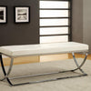 This contemporary accent bench features a sleek design coupled with a white faux leather seat. Chrome legs accent the bottom and contrast nicely against the bench's clean white seating. This bench is available in two colors.
