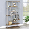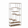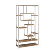 Contemporary bookcase with rustic tobacco herringbone shelves Metal frame electroplated in polished nickel Features ten 10 shelves of varying heights Metal MDF particle board and laminate construction