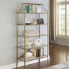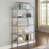 Modern art deco bookcase in a sophisticated matte gold finish Five 5 tiers shelving to show off framed family photos favorite books and artful accents Clear tempered glass shelves for added durability Metal and glass construction