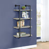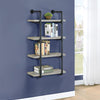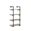 Industrial style 24W wallmounted shelf in grey driftwood finish Industrial black plumbing pipe metal frame Four 4 open shelves for display Metal MDF particle board and laminate construction