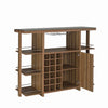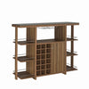 No need to hunt for that perfect wine bottle when they are all stored within this convenient bar unit Constructed from MDF and particle board this unit is finished in a walnut color and features a clear glass tempered top The plethora of shelves and spaces include three tiers of shelving with guard rails and a cabinet with an adjustable shelf Stemware racks are also available to keep glasses within easy reach An 18bottle wine rack completes this versatile piece
