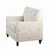 Featuring a classic scalloped back with solid wood legs in a red brown finish this beautiful accent chair is an elegant addition to any living space A script pattern upholstery adorns this piece offering a beautiful style to add you your space Plush rolled arms and pocket coil seating make this chair a cozy place to rest