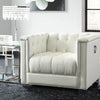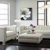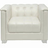 This contemporary chair from the Chaviano Collection is sure to spark some entertaining evenings in your living room With its low profile setting and deep button tufting this modern chair will impress your house guests This chair is upholstered in a white padded breathable faux leather with chrome legs and heavyduty chrome doorknocker handles for a unique touch