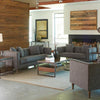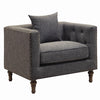 The Ellery Grey Chair is the perfect seat in the living room for the head of the household. This handsome piece features a grey tweed-like menswear material with antique weathered grey wooden finish. The tufted seat back and accent pillow complete the look. Pair this piece with others members of the Ellery Collection for a sophisticated living room collection.