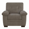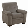 Classic comfort abounds with this casual oatmeal arm chair from the Fairbairn Collection Upholstered in a soft plush fabric with additional padding on the armrests and back cushion this arm chair will be a delight to relax upon after work during movie nights or when entertaining guests Enjoy the subtle design element of the back cushions two button tufts