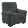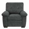 Classic comfort abounds with this casual charcoal arm chair from the Fairbairn Collection Upholstered in a soft plush fabric with additional padding on the armrests and back cushion this arm chair will be a delight to relax upon after work during movie nights or when entertaining guests Enjoy the subtle design element of the back cushions two button tufts