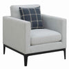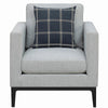 The Asherton Modern Grey Chair features crisp modern lines and a soft woven upholstery to fill your home with chic style and exceptional comfort With an accent pillow in navy plaid this piece adds a touch of refinement to a rustic living room or a dash of vintage charm to a modern space Fully reversible cushions offer easy maintenance while the solid wood frame ensures longlasting durability and comfort