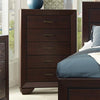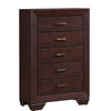 This solid chest from the Fenbrook Collection is a versatile piece for your bedroom at an exceptional value Constructed from Asian hardwood tropical wood and 3D paper vinyl this chest is finished in dark cocoa with antique brass drawer pulls Contrast black recessed grooves add dimension to the piece Five expansive drawers offer plenty of room for your wardrobe essentials This transitional piece will work well with most bedroom decor