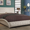 This stunning white upholstered eastern king bed will make a bold centerpiece in your master bedroom Accented with button tufting on the headboard and footboard and showcasing a curvaceous side rail this beds design is exceptional and distinct The bed is offered in both black and white faux leather