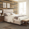 Think outside the box with this uniquely styled California King bed with a rolled headboard upholstered in beige fabric The headboard is covered in stylish button tufting and adorned with distinctive bronze nailhead trim The box frame also upholstered in beige fabric sets atop four wooden turned legs finished in cappuccino