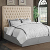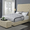 This chic bed from the Camille Collection will steal the show in your master bedroom With a solid frame and wood legs in a cappuccino finish this king bed is upholstered in a cream fabric with crystalbutton tufting on the headboard This king bed is also available in brown and grey fabrics