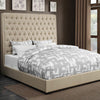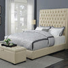 This chic bed from the Camille Collection will steal the show in your master bedroom With a solid frame and wood legs in a cappuccino finish this California king bed is upholstered in a cream fabric with crystalbutton tufting on the headboard This California king bed is also available in brown and grey fabrics