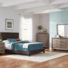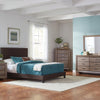 The cozy chic design of the Boyd Upholstered Twin Bed available in a variety of colors works with nearly any dcor from traditional to modern The bed is upholstered in brown and comes detailed with individual chrome nail heads framing the headboard Also features solid wood legs finished in warm espresso
