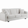 • Transitional style sofa bed upholstered in off white performance chenille• Convenient storage compartment under seat• Storage compartment and cup holder in both armrests• Back folds flat for easy conversion from sofa to bed• Two accent pillows included• Kiln-dried hardwood frame• Durable sinuous spring decking with high resilience foam seat• Also available charcoal (#360117) and tan (#360118)