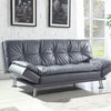 Welcome overnight guests in comfort with this futonstyle sofa bed from the Dilleston Collection This sleek collection features comfortable pillowtop seating adjustable armrests and a matching chaisestorage ottoman to keep extra bedding and other essentials nearby Upholstered in dark grey faux leather with white double row contrast stitching Also available in black white and brown faux leather