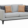 The Asherton Modern Grey Sofa features crisp modern lines and a soft woven upholstery to fill your home with chic style and exceptional comfort With accent pillows in navy plaid and faux suede this piece adds a touch of refinement to a rustic living room or a dash of vintage charm to a modern space Fully reversible cushions offer easy maintenance while the solid wood frame ensures longlasting durability and comfort