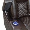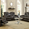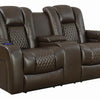 Kick your feet up with ease in this power motion reclining loveseat from the Delangelo Collection Upholstered in a brown breathable faux leather this loveseat features a quilt pattern on the seats and lower backs This loveseat is packed with several builtin gadgets such as power headrests hidden LED lights cup holders and popup wire management Two reclining seats are available on this sofa so you dont have to fight for comfort This sofa is also available in a black faux leather