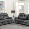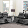 Power motion collection upholstered in dark grey performance faux suede Power recline with power headrests Wall hugger mechanism on sofa and loveseat Switch panel with 21A USB and home button Sofa features dropdown table with storage pocket and two 2 cup holders Loveseat console features softclosing lift top storage with power outlet 2AC2USB and two 2 cup holders with removable stainless steel inserts Pocket coil seating 1 30lbs cool gel memory foam topper Set includes sofa loveseat and recliner