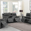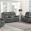 Power motion collection upholstered in dark grey performance faux suede Power recline with power headrests Wall hugger mechanism on sofa and loveseat Switch panel with 21A USB and home button Sofa features dropdown table with storage pocket and two 2 cup holders Loveseat console features softclosing lift top storage with power outlet 2AC2USB and two 2 cup holders with removable stainless steel inserts Pocket coil seating 1 30lbs cool gel memory foam topper Set includes sofa loveseat and recliner