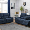 Power motion collection upholstered in navy blue performance chenille Power recline with power headrests Wall hugger mechanism Switch panel with 21A USB and home button Sofa features dropdown table with storage pocket popup power outlet 2AC2USB and two 2 cup holders Loveseat console features softclosing lift top storage with dual USB outlet and two 2 cup holders with removable stainless steel inserts Pocket coil seating 1 30lbs cool gel memory foam topper Set includes sofa and loveseat