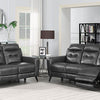 • Power motion collection upholstered in charcoal top grain leather everywhere the body touches• Wall hugger mechanism• 2-over-2 sofa configuration• Switch panel with 2.1A USB• Full foam seating• 1” 3.0lbs cool gel memory foam topper• Certi-Pur certified foam• Tapered solid birch wood legs finished in black• Set includes sofa and loveseat