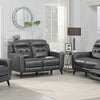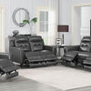 Power motion collection upholstered in charcoal top grain leather everywhere the body touches Wall hugger mechanism 2over2 sofa configuration Switch panel with 21A USB Full foam seating 1 30lbs cool gel memory foam topper CertiPur certified foam Tapered solid birch wood legs finished in black Set includes sofa loveseat and recliner