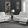 • Power motion collection upholstered in white top grain leather everywhere the body touches• Wall hugger mechanism• 2-over-2 sofa configuration• Switch panel with 2.1A USB• Full foam seating• 1” 3.0lbs cool gel memory foam topper• Certi-Pur certified foam• Polished chrome electroplated stainless steel legs• Set includes sofa and loveseat