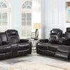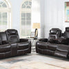 Power motion collection upholstered in espresso breathable performance polyurethane Power recline with power headrests Wall hugger mechanism Switch panel with 21A USB and home button Lift top storage armrests Sofa features dual LED reading light dropdown table with storage pocket popup power outlet 2AC2USB and two 2 cup holders Loveseat console features softclosing lift top storage and two 2 cup holders with removable stainless steel inserts Full foam seating 1 30lbs cool gel memory foam topper CertiPur certified foam Set includes sofa and loveseat