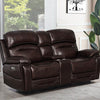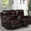 Power motion loveseat upholstered in dark brown top grain leather everywhere the body touches Two 2 power reclining seats with power headrest and power lumbar Wall hugger mechanism Switch panel with 2 programmable memory buttons 21A USB and home button Console features softclosing lift top storage with power outlet 2AC2USB and two 2 cup holders with removable stainless steel inserts Pocket coil seating 1 30lbs cool gel memory foam topper