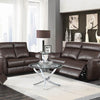 • Power motion collection upholstered in dark brown breathable performance polyurethane• Power recline with power headrests• Wall hugger mechanism• 2-over-2 sofa configuration• Switch panel with 2.1A USB and home button• Pocket coil seating• 1” 3.0lbs cool gel memory foam topper• Set includes sofa and loveseat