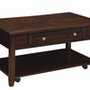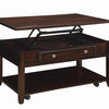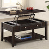 This versatile coffee table will look great in most living rooms With its rich walnut finish this coffee table features a unique lifttop and a bottom shelf for storage options Metal hardware drawer pull finishes the look This coffee table is both stylish and functional for your living room