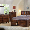 If you are looking for a bed that offers plenty of storage as well as impeccable design the storage bed from the Hillary Collection is the right choice The design of this bed is stunning with no detail forgotten Four drawers found in the footboard feature a rounded front a detail not often found anymore Additional drawers can be found on the sides of the beds base Not to be out done the headboard offers two open shelves on either side of two more drawers with curved front panels All of these details are enveloped in a beautiful warm brown finish over maple veneers