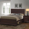 Comfort and organization meet with this attractive storage bed from the Fenbrook Collection This bed features clean lines and a deep cocoa finish for a style to suit any interior theme Side drawers offer space for extra bedding or throw blankets Feel free to stretch out kick back and unwind at the end of a long day the expansive eastern king size can surely accommodate