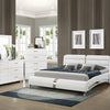 You wont find a bedroom collection with a more modern design than this This Eastern King bed exudes highend style with its white polyurethane upholstery on the headboard footboard and side panels The sides and foot of the bed are also accented with sleek metal arches while the headboard features to columns of padded panels