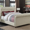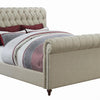 Sleep like royalty every night in the upholstered king bed from the Gresham Collection This traditional bed is constructed with a pine and plywood frame and is upholstered in a beautiful beige woven fabric Elegant scrolled buttontufted accents can be found on the headboard and footboard This king bed is finished with individuallyapplied bronze nailhead trim and cappuccino legs