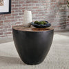 With a unique shape reminiscent of a tapered drum this end table is sure to make a striking addition to your interior dcor The reclaimed wood top features stripes of vibrant green and teal perfect for spaces that crave just a splash of color This piece would look fantastic alongside smaller living room furniture and would make a great replacement for traditional nightstands in the bedroom