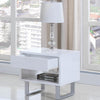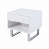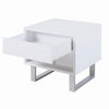 Minimalism meets glamour with this contemporary end table in bright glossy white Ushaped legs with a brushed nickel metal finish give this piece a lightweight aesthetic and a unique sense of visual balance A single drawer makes it easy to keep essentials tucked away while an open lower shelf offers opportunity to display favorite decorations
