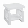 Decorative interlocking frames give this end table artistic appeal while the overall composition remains on the minimalist side thanks to its glossy white finish This piece features a lower shelf for extra storage or display space While this piece would make an attractive addition to any contemporary living room it can also be used as an alternative to bedroom nightstands
