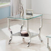 Brighten your interior with a touch of glitz and glamour by including this contemporary side table in dazzling chrome Decorative legs catch the eye and a small mirrored shelf expands storage opportunities Use this piece as a standalone showstopper or pair with matching chrome tables to create a living room aesthetic that exudes glamour