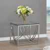 Create a stunning focal point anywhere with this intricate side table finished with dazzling chrome The simple glass top allows all attention to fall directly on the swooping curved accents allowing this piece to stand on its own as a source of decorative appeal Use this piece in the living room bedroom or anywhere else that can benefit from contemporary style