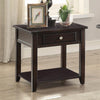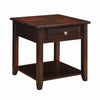 This versatile end table will look great in most living rooms With its rich walnut finish this end table features one drawer and a bottom shelf for storage options Metal hardware drawer pull finishes the look This square end table is anxiously awaiting to be added to your living room